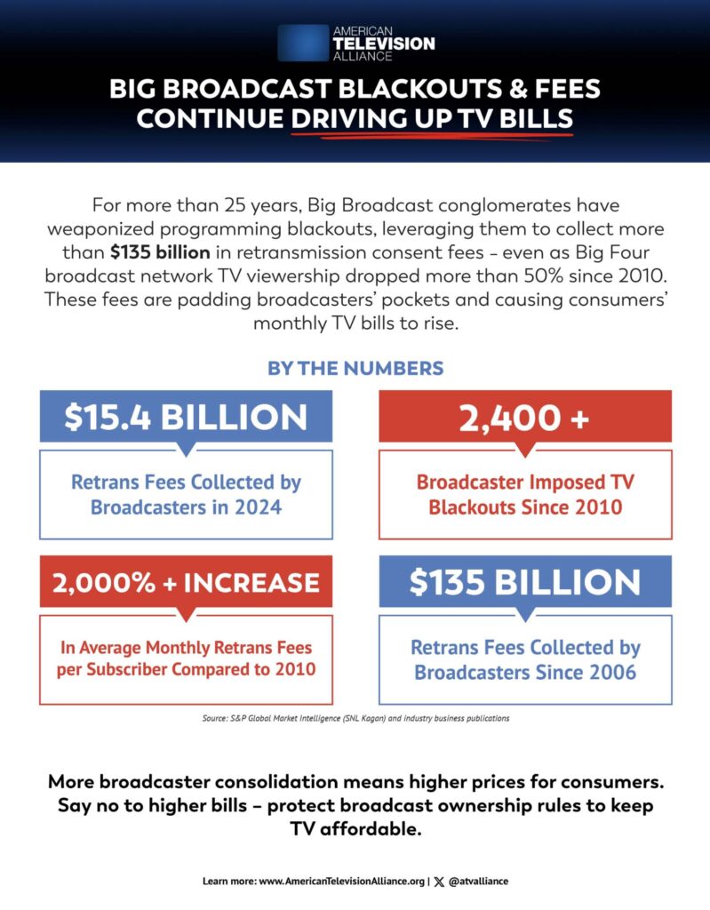 These blackouts occur when broadcasters unilaterally remove their channels from TV lineups, blacking out content from cable and satellite subscribers. Broadcasters then hold their channels for ransom until TV providers agree to pay more – the same channels that are available for free over-the-air. These payments to broadcasters for “free” TV are called retransmission (or “retrans”) fees.